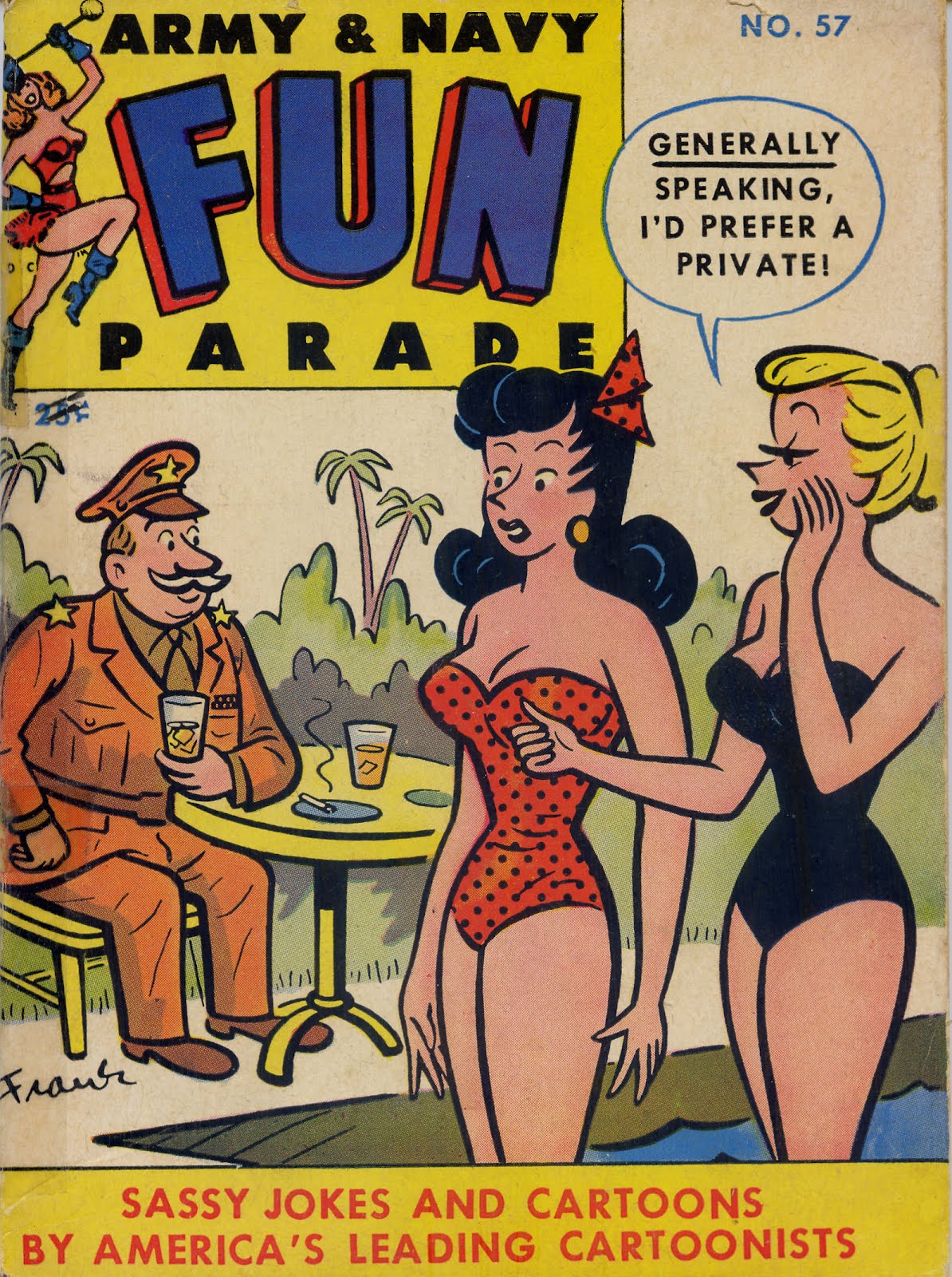I was in Oregon recently and picked up a copy of this: "Army & Navy Fun Parade" #57, October 1952. I had heard about these more "adult" joke books that Harvey produced but was never able to find one, even on Ebay. I found this one for a buck! Inside there is a photo of Janet Leigh and one of opera singer Lucille Norman, plus single page gag cartoons and text pages of jokes. It's digest sized and 100 pages.